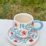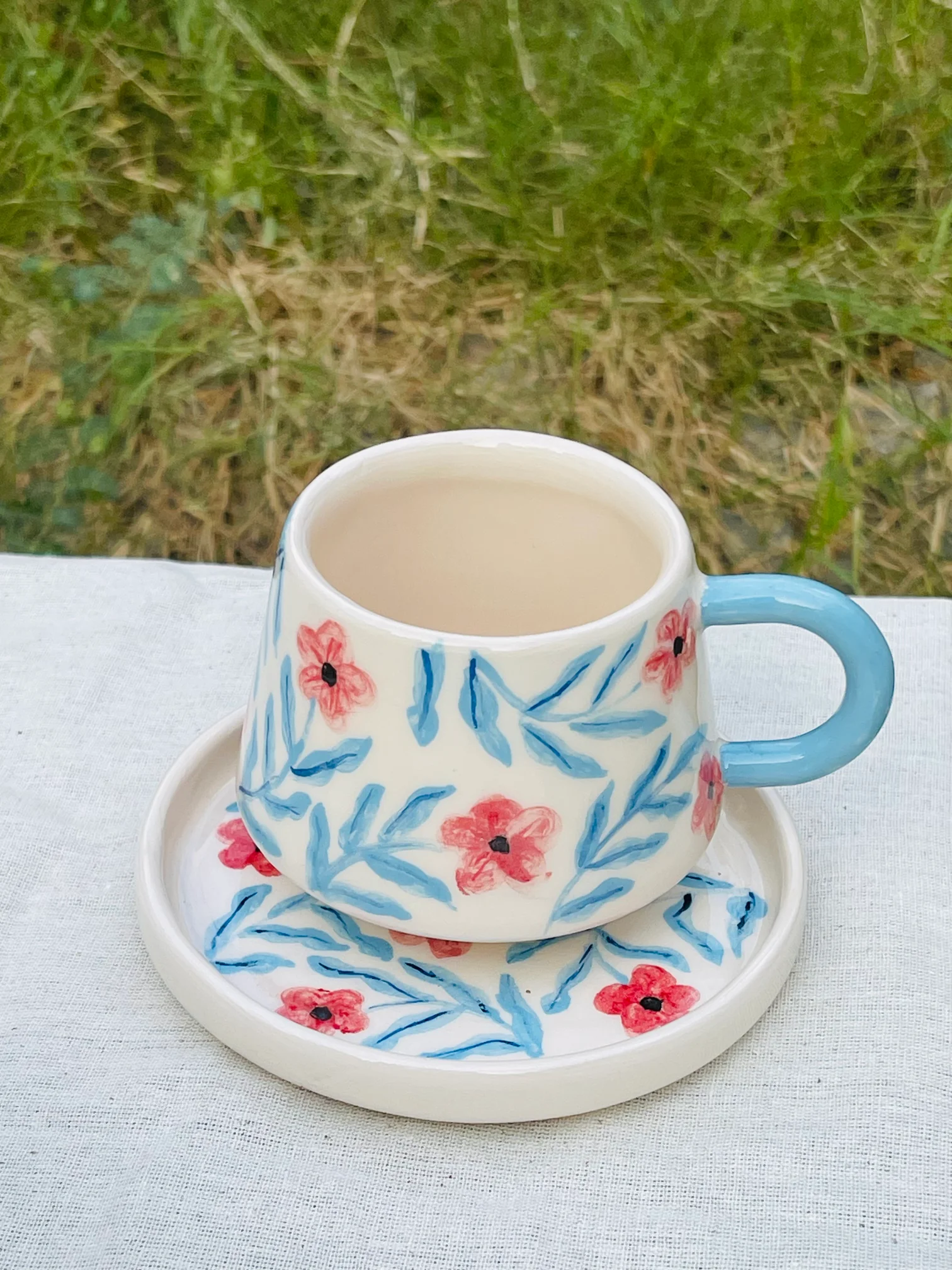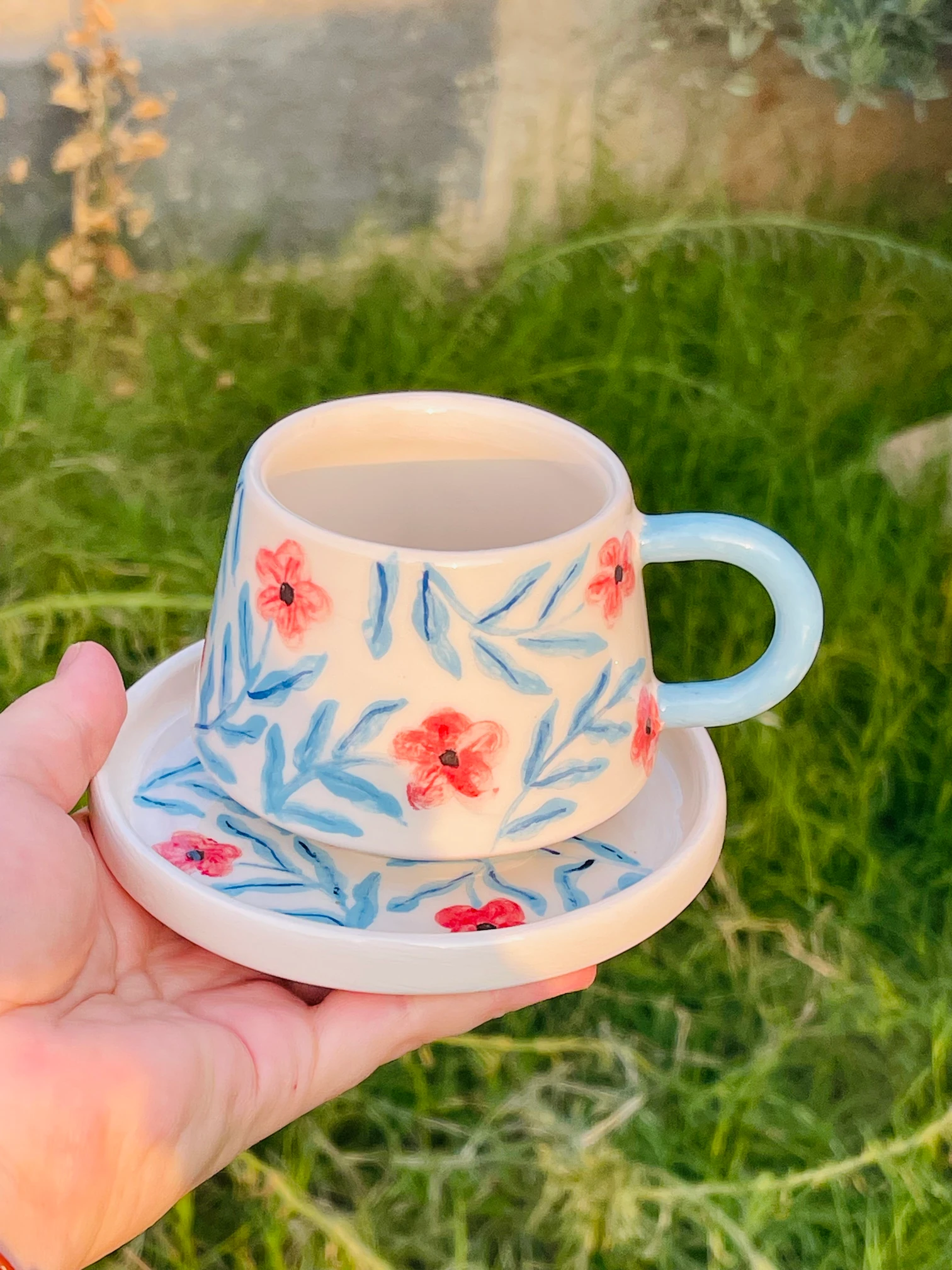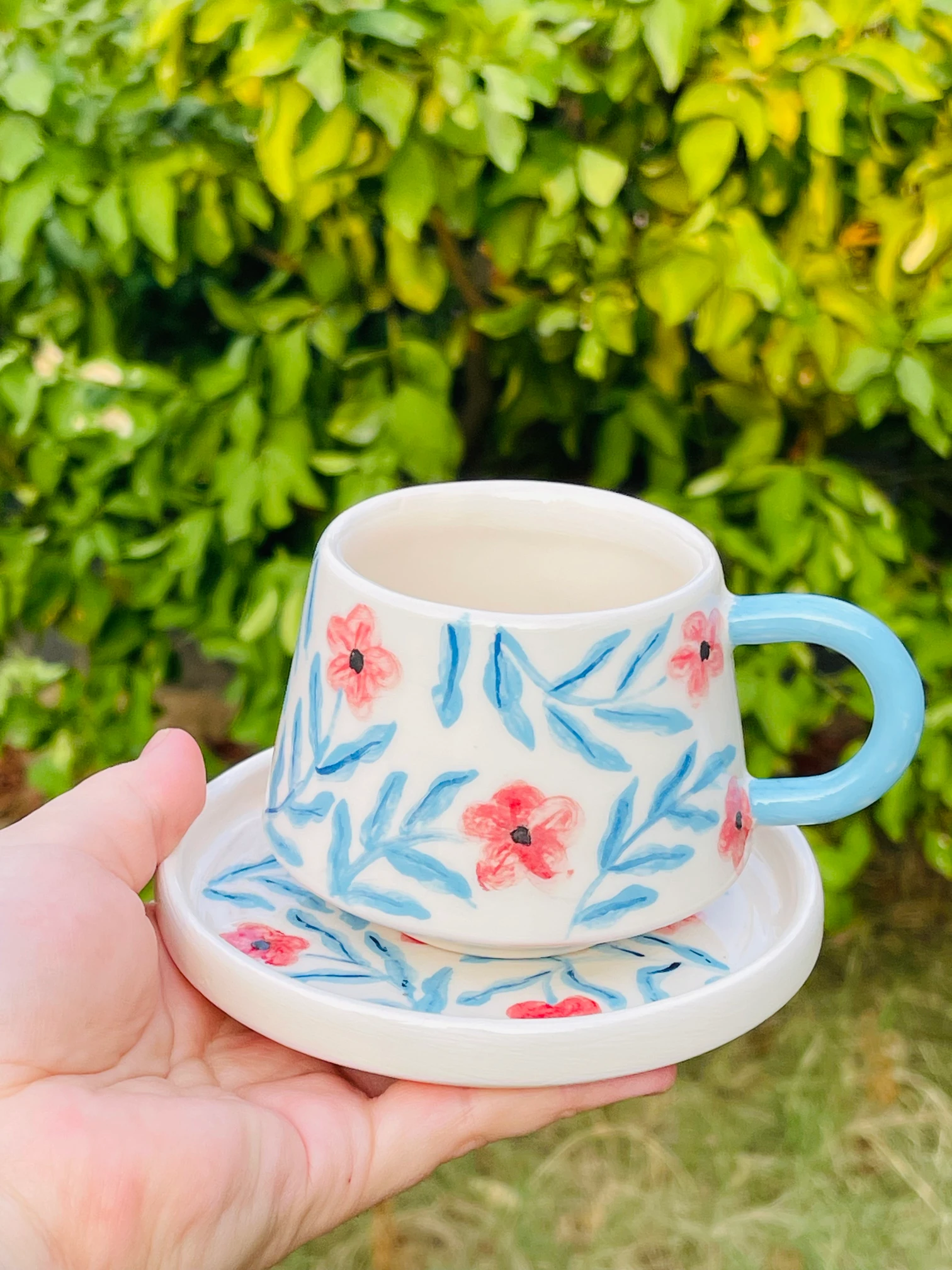 %100 el yapımı bu özel tasarım, kırmızı çiçeklerin canlılığı ve mavi yaprakların huzur verici tonlarıyla her yudumda baharın tazeliğini hissettiriyor.